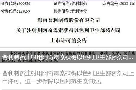 华体会体育APP网站/手机版下载/官网登录入口 (以下简称“普利制药”或“公司”)于近日收到了以色列卫生部药剂司签发的注射用阿奇霉...
